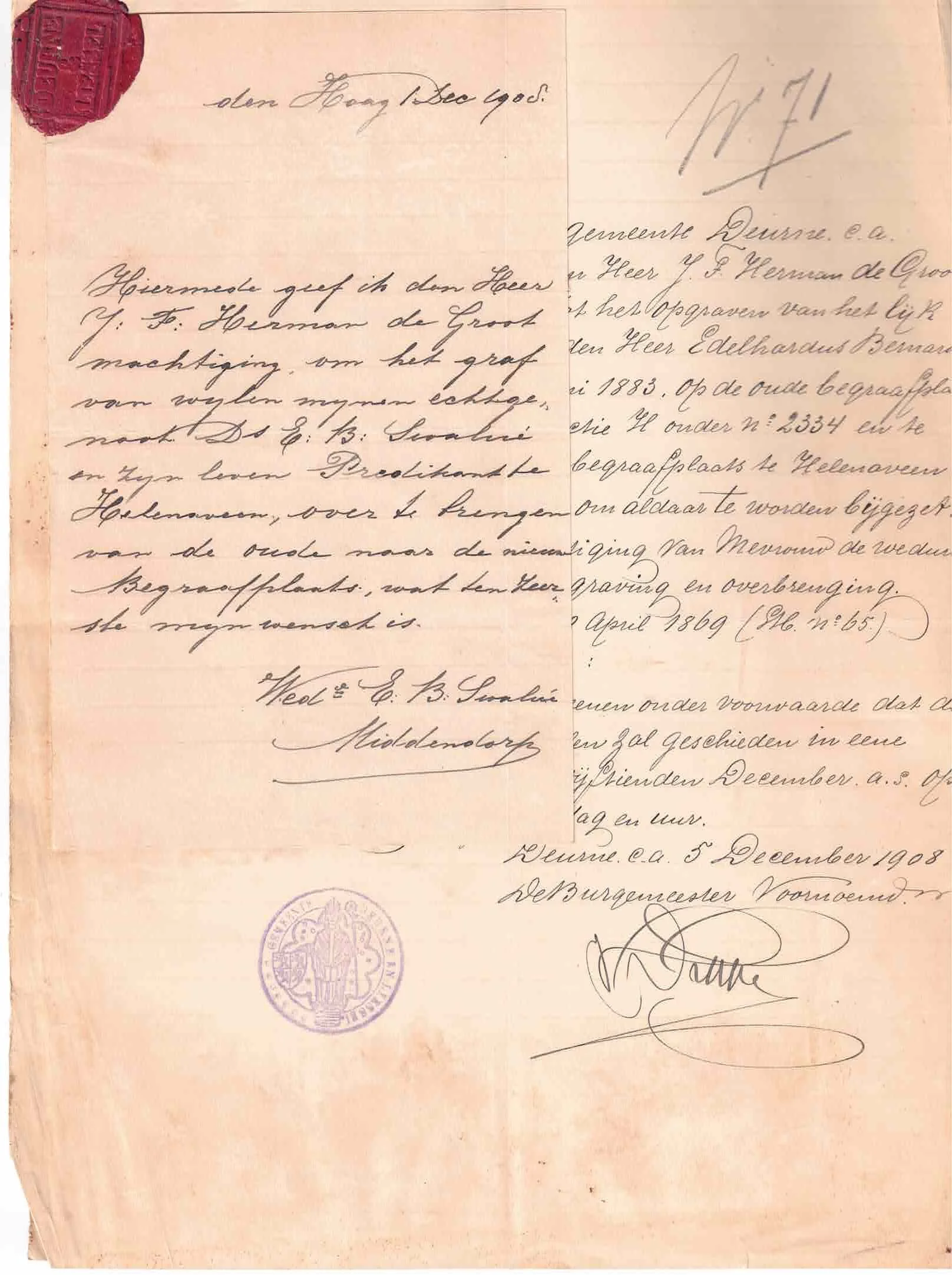 Toestemming van Wed. Swalue-Middendorp om het graf te verplaatsen