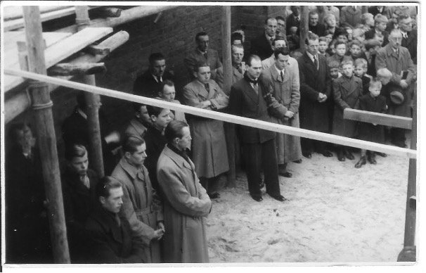 Foto eerste steen legging Kerk met de klas van meester Theelen